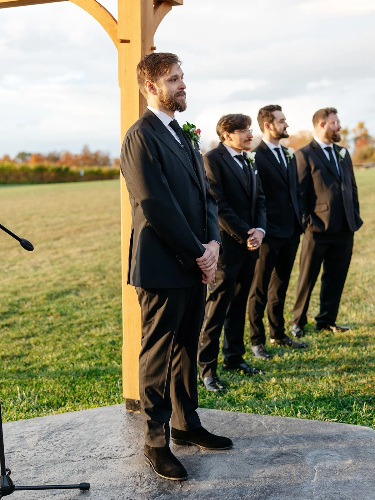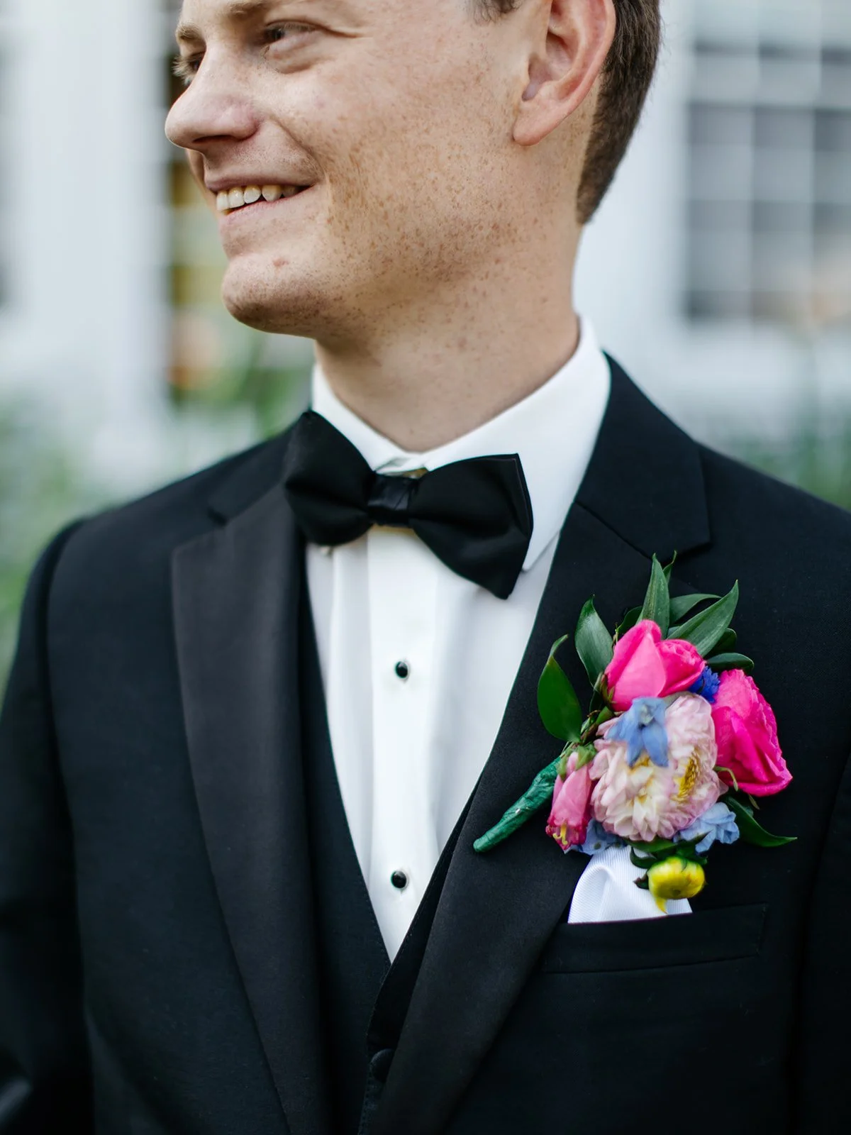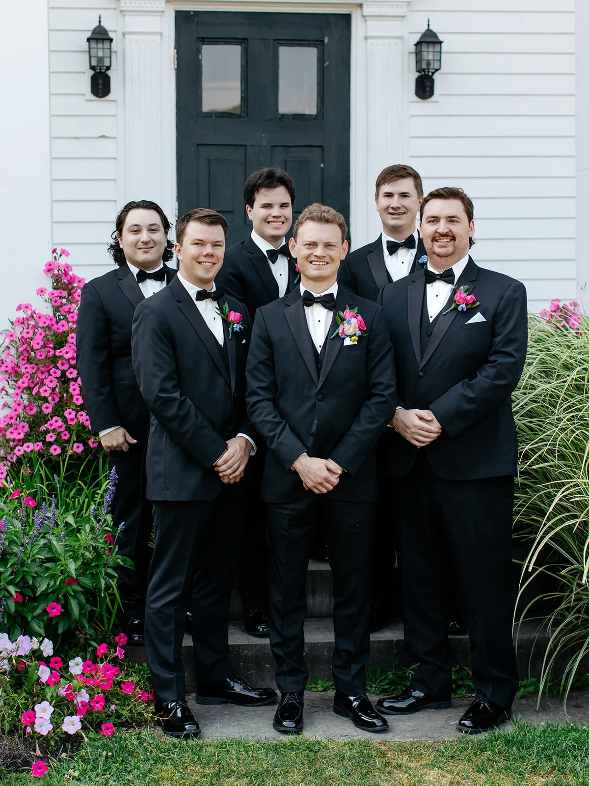 The groom’s boutonniere often becomes the reference point. From it, we build a cohesive language of flowers that carries through the groomsmen and connects seamlessly to the bridal bouquet and bridesmaids’ arrangements.